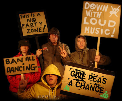 On closer inspection though, we find their rants are a little spurious. 'Give peas a chance' is the song, down with loud music reads the placard.