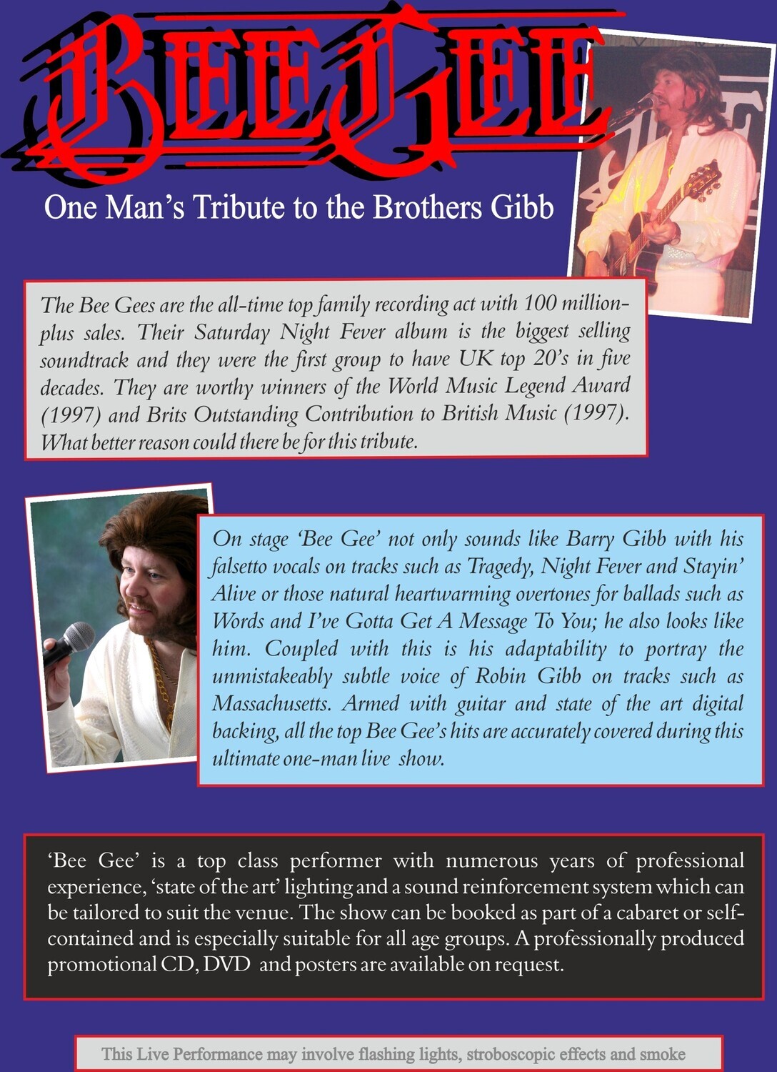 Armed with guitar and state of the art digital backing complete with harmonies, all the top Bee Gee hits are accurately covered.